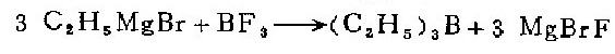 1. In a 1-liter three-necked flask equipped with a mercury-sealed stirrer, reflux cooler, dropping funnel and air guide, put 72 grams (3.0 grams atoms) of magnesium chips and 250 ml of anhydrous water. Butyl ether. Under nitrogen protection, slowly add 500 ml of anhydrous butyl ether solution containing 327 g (3.0 mol) of ethane to prepare Grignard reagent. The reaction started very violently, so the flask must be immersed in a cold water bath to cool, and then 400 ml of butyl ether solution containing 61 g (0.9 mol) boron trifluoride was added dropwise within 4 hours. Afterwards, heat at 70°C for 2 hours. (After the reaction is completed, replace the condenser with a ground glass stopper, and the unsealed stirrer with a short fractionator. . Such changes in the apparatus should be carried out quickly with a rapid nitrogen flow to avoid exposure of the mixture to air). Directly distill the reaction mixture and collect the fractions at 94—97°C to obtain 65 grams (74%) of crude triethylboron.