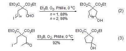 Triethylboron combined with oxygen It can also realize the addition reaction of intramolecular alkane radicals to aldehydes and ketones without the participation of tin. For example, ω-iodoaldehyde can effectively undergo intramolecular formation under the induction of 10 times triethylboron. Ring reaction (Formula 2) [2], ω-iodoketone can also obtain the ring-forming product in high yield under 20 times of triethylboron induction (Formula 3 ).