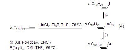 Triethylboron can also be used In the hydroindiumation reaction of alkynes and alkenes (Formula 4)[3]. The alkenyl indium produced by the reaction can undergo a one-step cross-coupling reaction with halogenated aromatic hydrocarbons or other electrophiles.